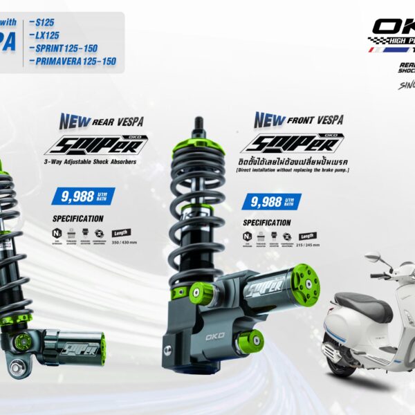โช๊คหน้าสีเขียวสำหรับVespa รุ่นSniper ยาว215mm/245mm และโช๊คหลังVespa รุ่นSniper ยาว350mm/430mm