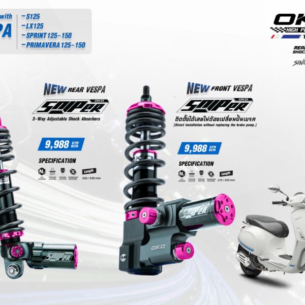 โช๊คหน้าสีชมพูสำหรับVespa รุ่นSniper ยาว215mm/245mm และโช๊คหลังVespa รุ่นSniper ยาว350mm/430mm