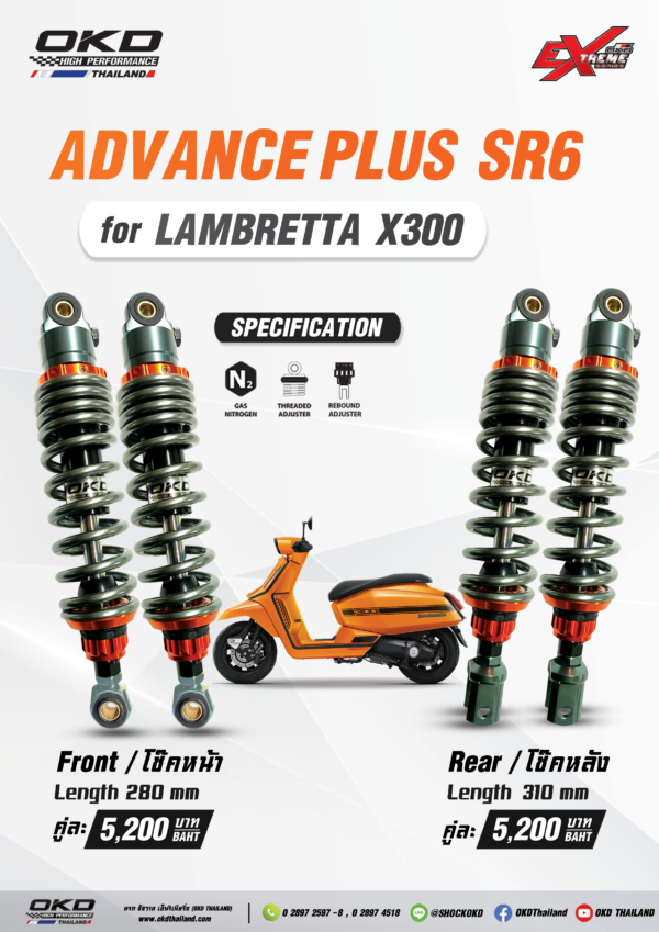 โช๊คหลังใส่Lambretta X300 จะเป็นหูผ่าครับ แอดแนะนำรุ่น AdvancePlus SR6 Edition ราคาคู่ละ 5200 บาทครับ ความยาวโช๊คหลังเดิมๆ ยาว 320 mmครับ สเปคโหลดทำได้ยาว 310 mmครับ สามารถปรับสปริงแข็งอ่อน(พรีโหลด)ช่วยให้รับน้ำหนักมากขึ้นได้ครับ และปรับความหนืด(รีบาว)ได้22ระดับ ช่วยให้โช๊คคืนตัวช้าลงครับ, แกนใหญ่15mm สินค้ารับประกัน 1 ปี โช๊คเป็นระบบน้ำมันไฮโลลิค+แก๊สไนโตรเจนครับ สมรรถนะดีเยี่ยมกว่าโช๊คเดิมครับ
